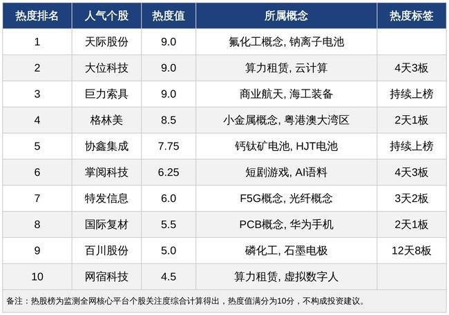 今日股票按月配资开户,A股十大人气热股如下:天际股份、大位科技、巨力索具、格林美、协鑫集成、掌阅科技、特发信息、国际复材、百川股份、网宿科技。