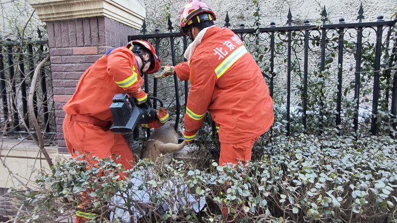 “有只动物卡在栏杆里了,请你们帮忙救援。”1月27日早上7时52分,门头沟区永定消防救援站接到市民紧急求助。消防员火速赶到现场,发现一只狍子正卡在一个居民小区外围护栏的缝隙中,动弹不得。
