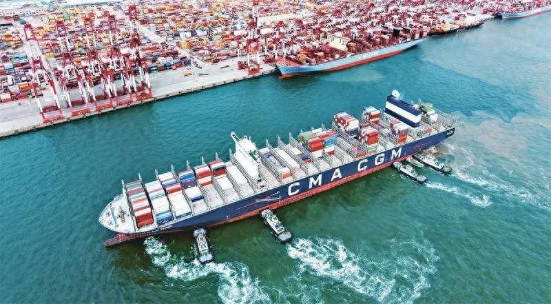 在新发展理念引领下,我国锚定高质量发展方向不动摇,推动发展动能向新、经济结构向优、民生保障更实,为应对各种不确定性提供了坚实的内在支撑。图为2025年10月20日,在山东港口青岛港,一艘货轮在拖船辅助下停靠集装箱码头。 新华社发 俞方平/摄